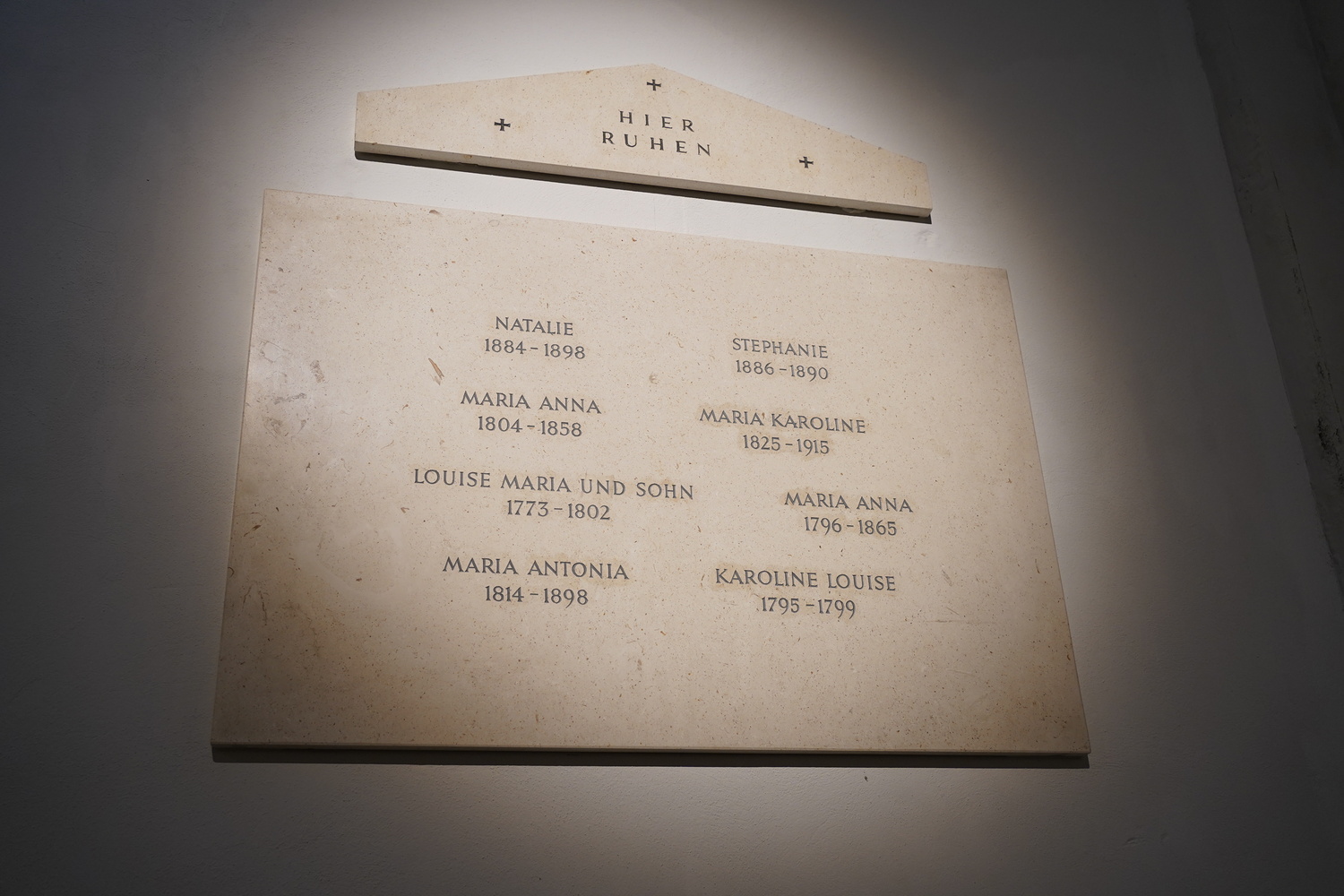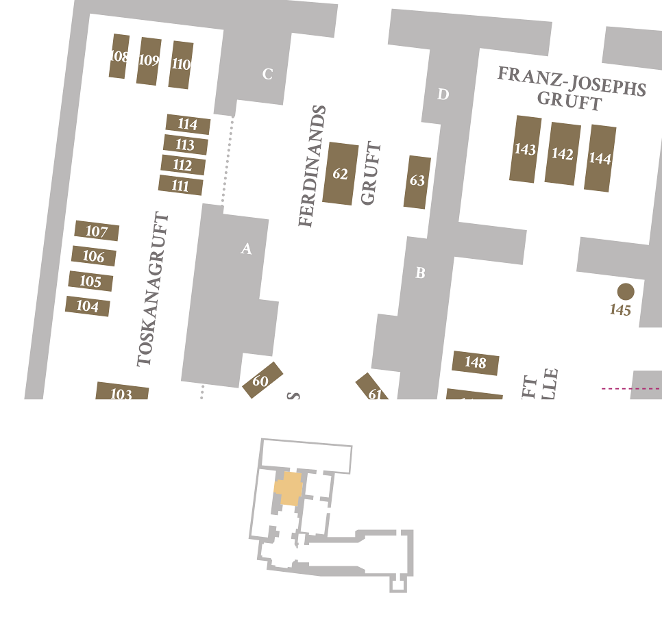 Die Nischen sind heute zugemauert, nur vier Marmortafeln verraten die Namen jener 37 Habsburger, die in einer großangelegten Umbettungsaktion 1960 hier bestattet wurden, um die Platznot in der Toskanagruft zu mildern. In der Gruft selbst sind Kaiser Ferdinand I. (N°62) und seine Gemahlin Maria Anna (N°63) in Prunksarkophagen bestattet.