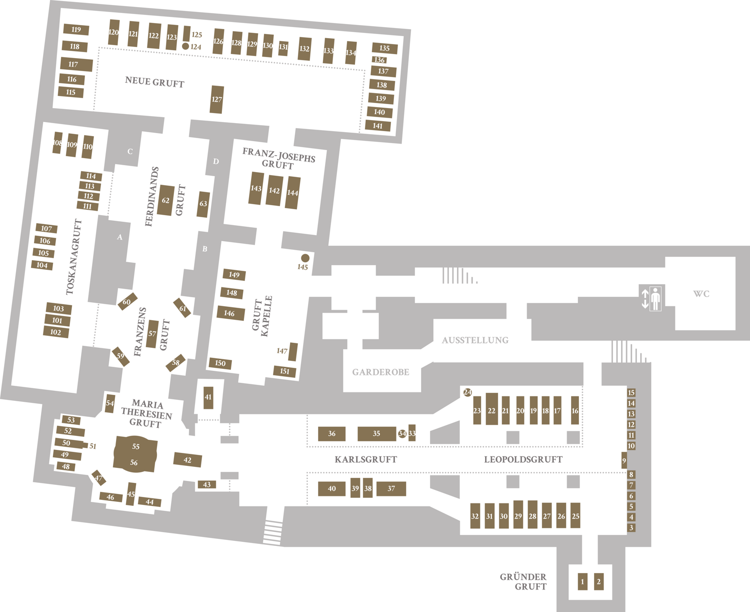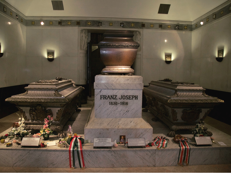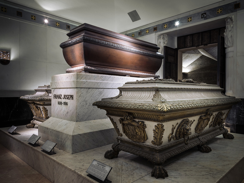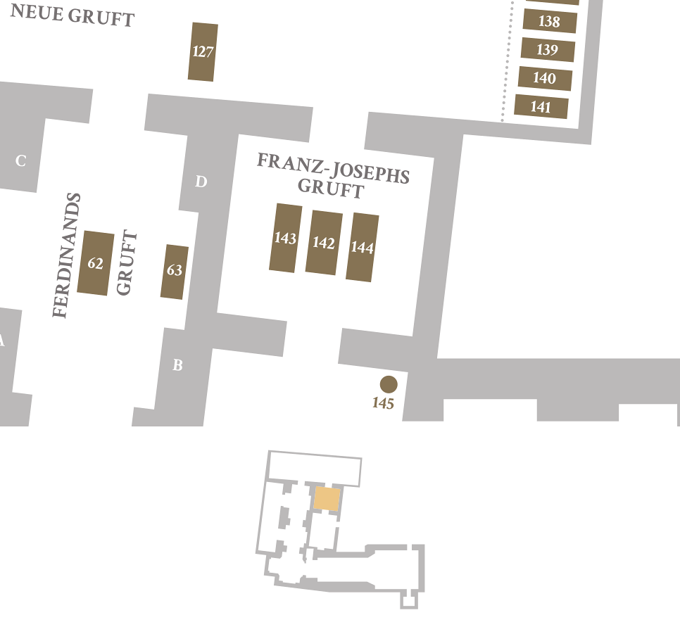 Anlässlich seines 60. Regierungsjubiläums hatte Kaiser Franz Joseph I. (N°142) 1908 weitere Kellerräume des Klosters in die Gruft einbeziehen lassen und den Auftrag gegeben, eine Kapelle und ein würdiges Mausoleum für sich, seine Gattin Kaiserin Elisabeth (N°143) und den Thronfolger, Kronprinz Rudolf (N°144), zu gestalten.