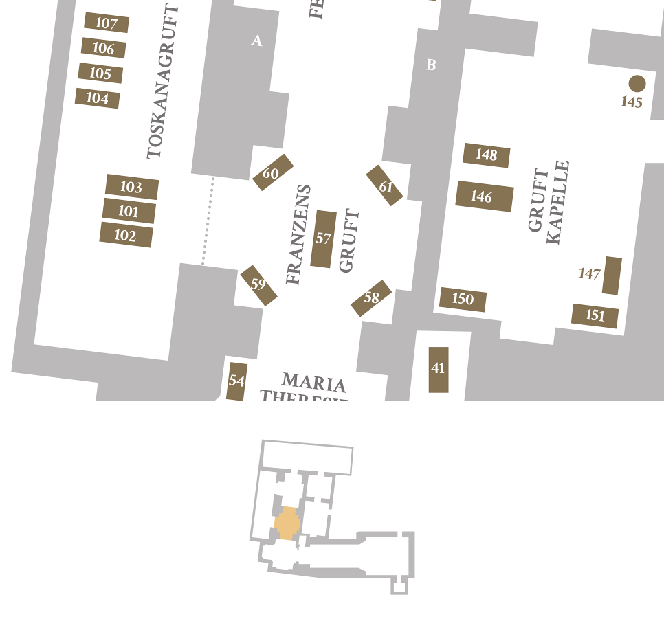 Nach dem Wiener Kongress, 1824, beschloss Kaiser Franz II.(I.) eine neuerliche Erweiterung der kaiserlichen Begräbnisstätte, da in der Kapuzinergruft weder Platz für ihn noch für seine Nachkommenschaft vorhanden war. Der Kaiser gab den Auftrag, eine neue Grabkammer anzulegen, in Anlehnung an die Baugestalt der Maria-Theresien-Gruft und im rechten Winkel zu dieser. Die Franzensgruft ist achteckig und im Stil des Biedermeier gehalten. In symmetrischer Anordnung der Sarkophage ruhen hier Kaiser Franz II.(I.) (N°57) und seine vier Gemahlinnen.