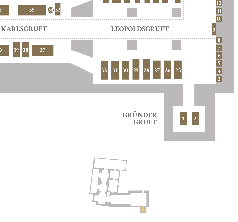 Die Gründergruft ist der älteste Teil der Kaisergruft (1622-1632), der auf die Stiftung der Kaiserin Anna von Tirol (N°1) zurückgeht und unter der Kaiserkapelle liegt.
