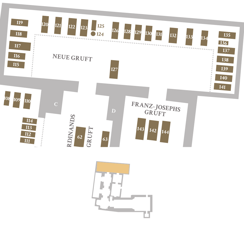 Durch Umgruppierungen in der Kapuzinergruft beherbergt sie 26 Sarkophage aus drei Jahrhunderten und entlastete somit die beengte Gruft. An der westlichen Schmalseite wurden die Särge der aus der Habsburger Dynastie stammenden geistlichen Würdenträger untergebracht, an der östlichen Schmalseite die Eltern und Verwandten von Kaiser Franz Joseph I. (N°142).
