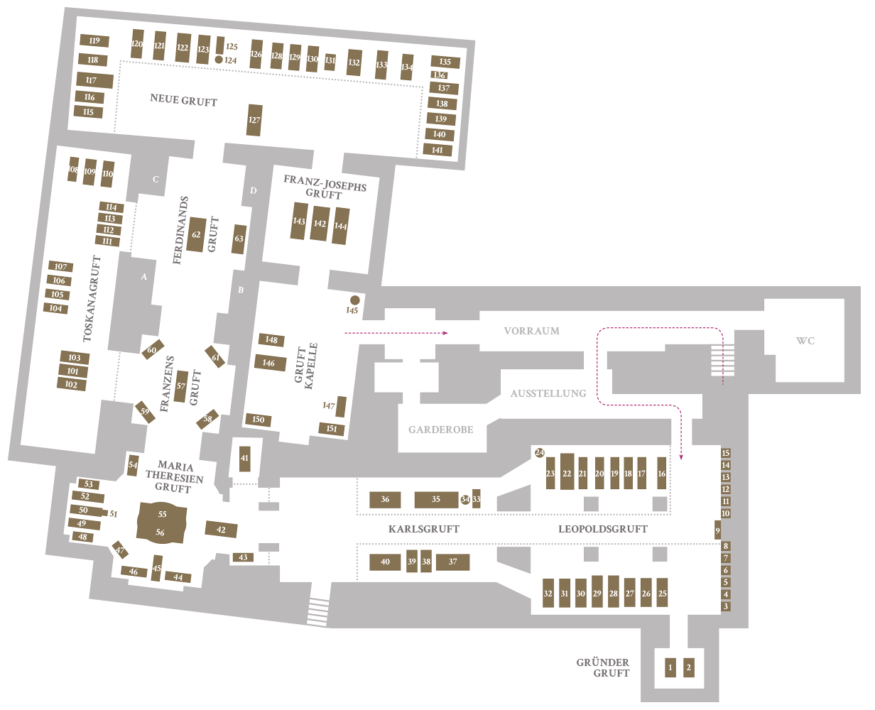 Through regrouping in the Capuchin Crypt, it houses 26 sarcophagi from three centuries, thus relieving the cramped crypt. The coffins of the ecclesiastical dignitaries from the Habsburg dynasty were placed on the narrow western side, while the parents and relatives of Emperor Franz Joseph I. (N°142) were placed on the narrow eastern side.